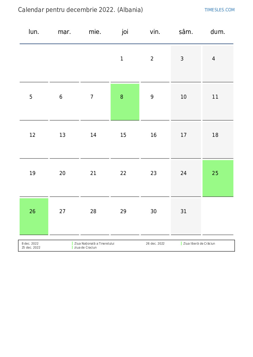 Calendarul sărbătorilor și weekendurilor pentru decembrie 2022 pentru Albania