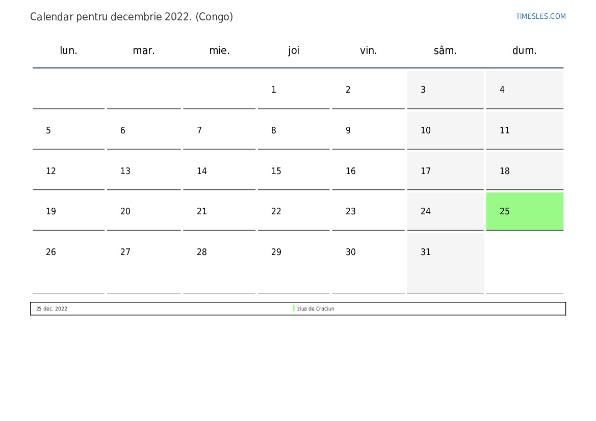 Calendarul sărbătorilor și weekendurilor pentru decembrie 2022 pentru Congo