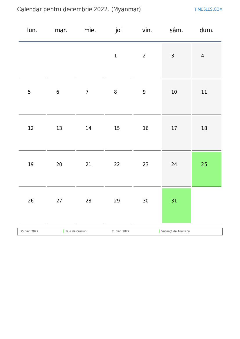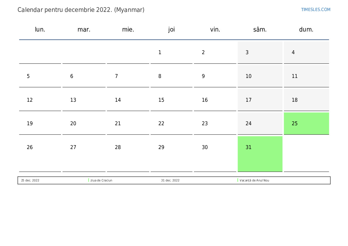 Descărcați și tipăriți calendarul PDF cu sărbătorile și weekendurile pentru decembrie 2022 pentru Myanmar