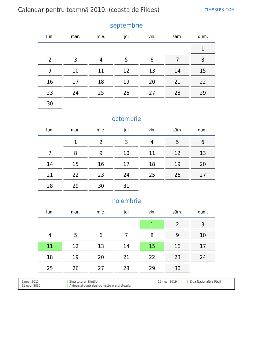 Descărcați și tipăriți calendarul PDF cu sărbătorile și weekendurile pentru toamnă anului 2019 pentru Coasta de Fildeș