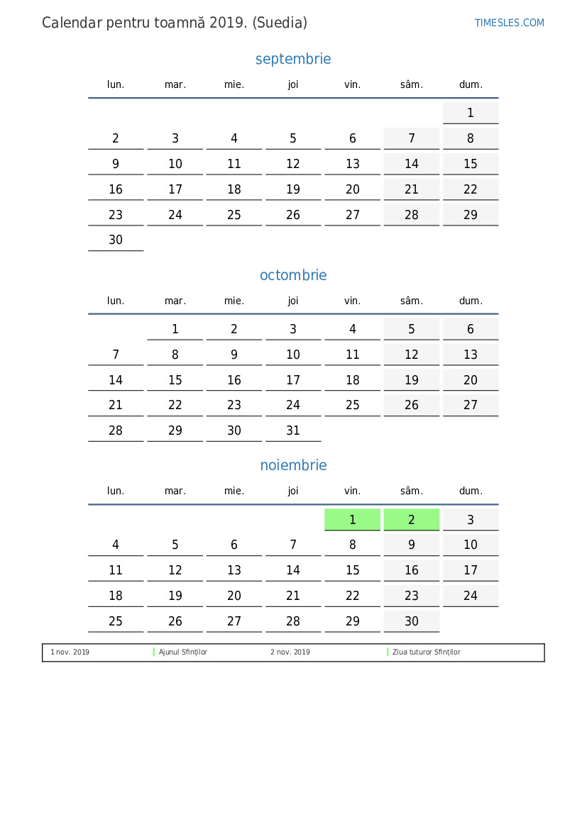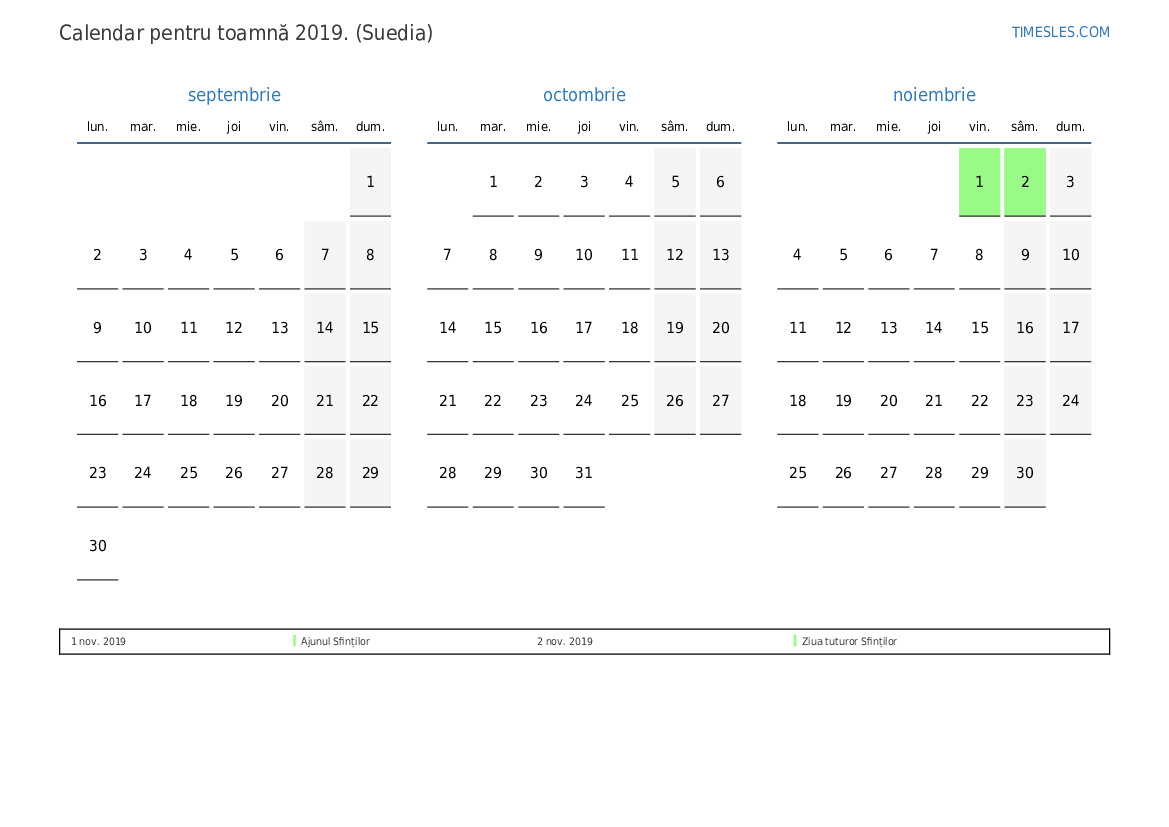Descărcați și tipăriți calendarul PDF cu sărbătorile și weekendurile pentru toamnă anului 2019 pentru Suedia