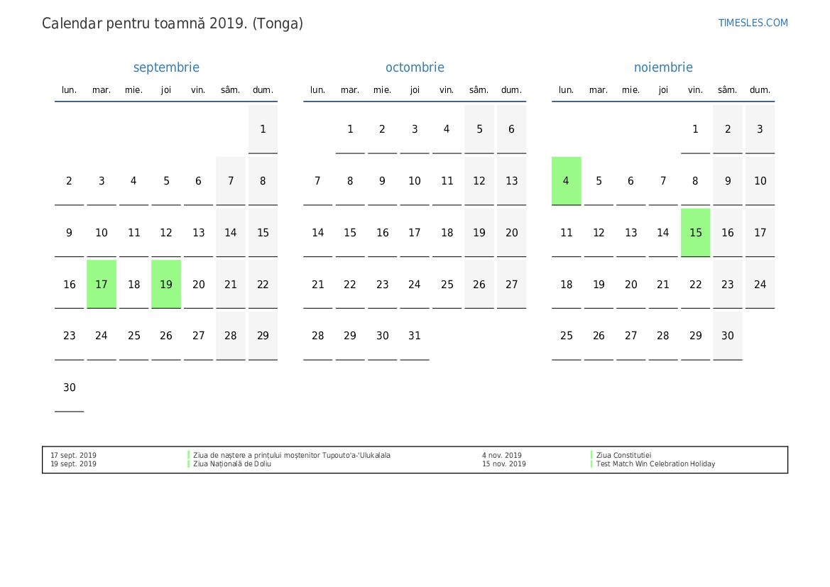 Descărcați și tipăriți calendarul PDF cu sărbătorile și weekendurile pentru toamnă anului 2019 pentru Tonga