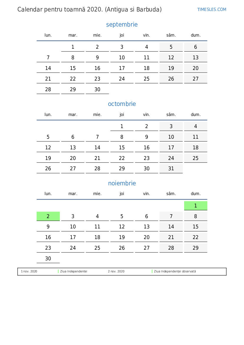 Descărcați și tipăriți calendarul PDF cu sărbătorile și weekendurile pentru toamnă anului 2020 pentru Antigua și Barbuda