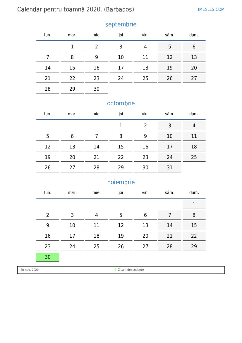 Descărcați și tipăriți calendarul PDF cu sărbătorile și weekendurile pentru toamnă anului 2020 pentru Barbados