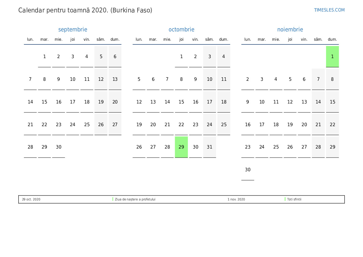 Descărcați și tipăriți calendarul PDF cu sărbătorile și weekendurile pentru toamnă anului 2020 pentru Burkina Faso