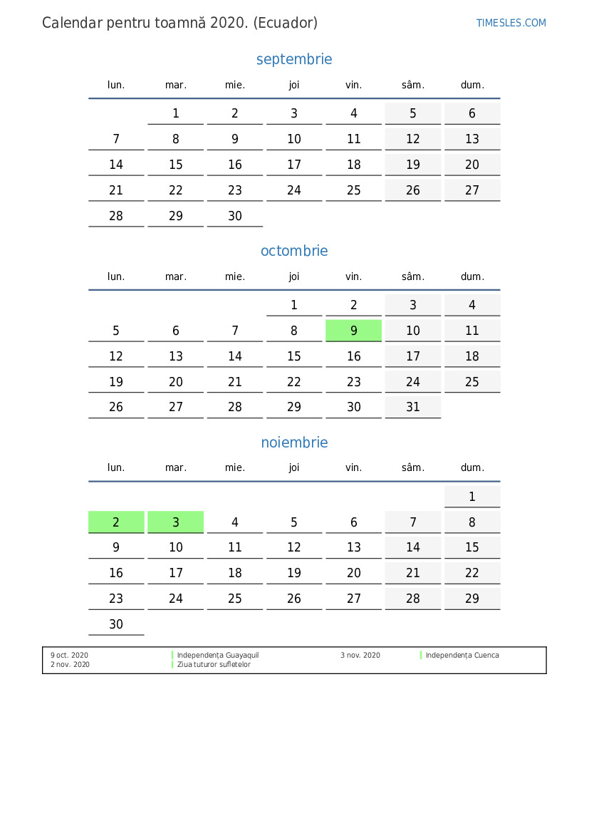 Descărcați și tipăriți calendarul PDF cu sărbătorile și weekendurile pentru toamnă anului 2020 pentru Ecuador