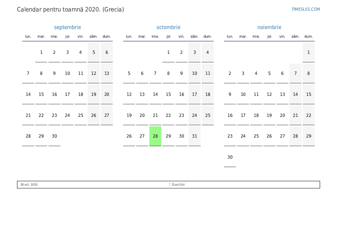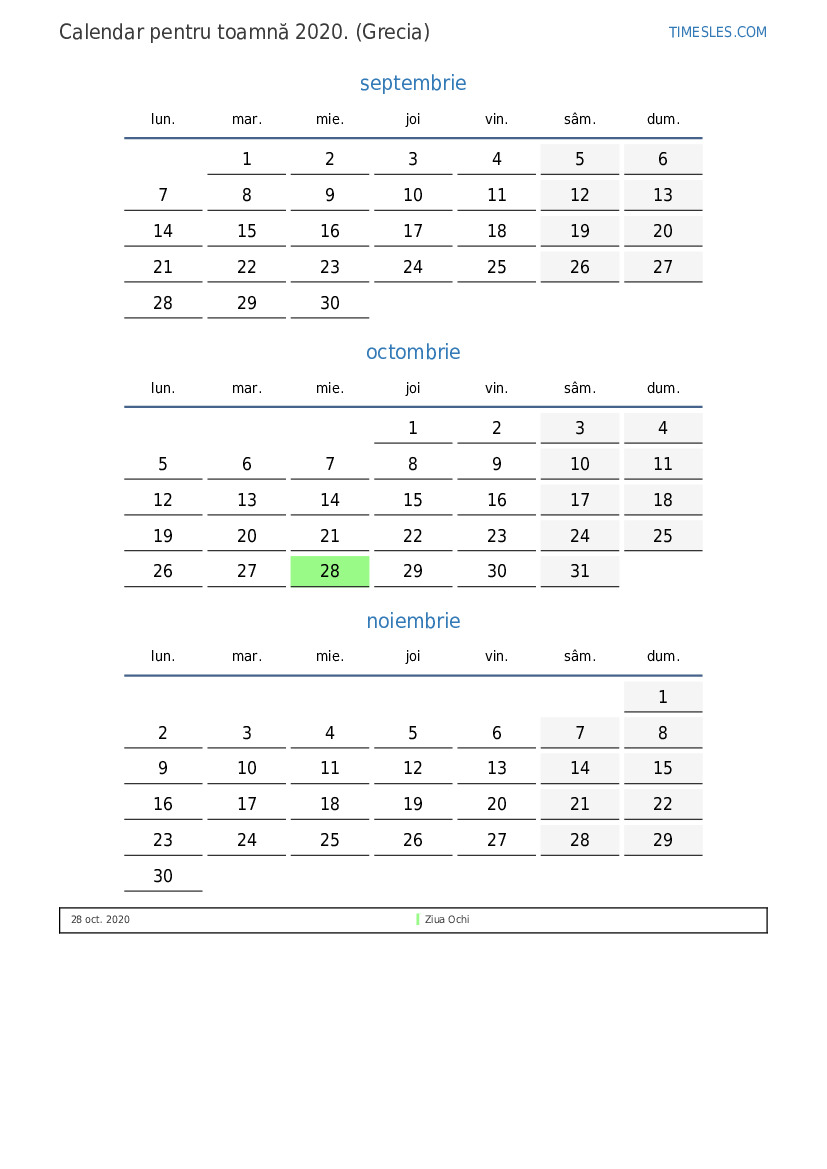 Descărcați și tipăriți calendarul PDF cu sărbătorile și weekendurile pentru toamnă anului 2020 pentru Grecia
