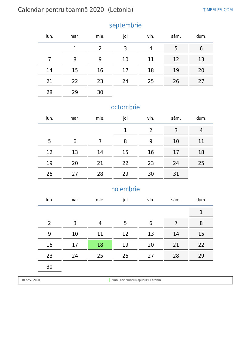 Descărcați și tipăriți calendarul PDF cu sărbătorile și weekendurile pentru toamnă anului 2020 pentru Letonia