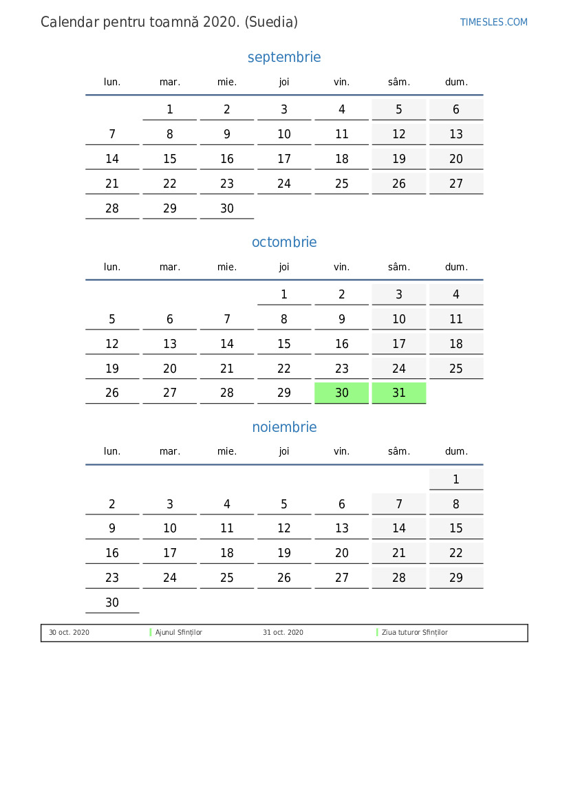 Descărcați și tipăriți calendarul PDF cu sărbătorile și weekendurile pentru toamnă anului 2020 pentru Suedia