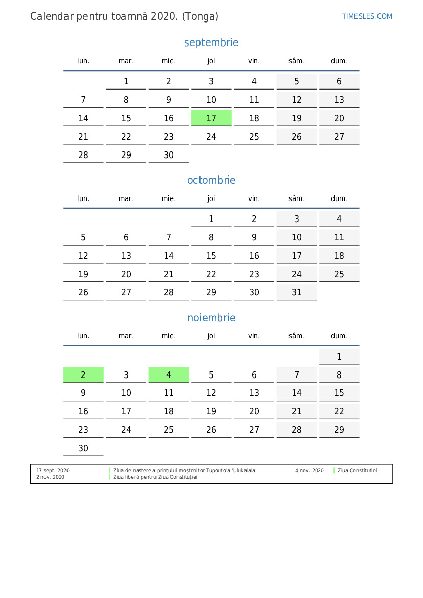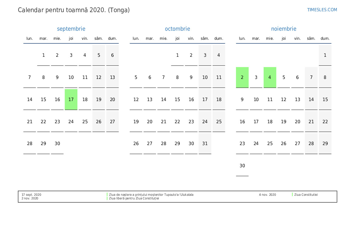 Descărcați și tipăriți calendarul PDF cu sărbătorile și weekendurile pentru toamnă anului 2020 pentru Tonga