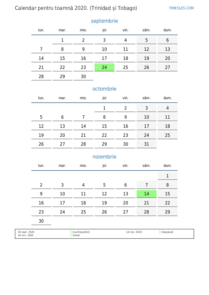 Descărcați și tipăriți calendarul PDF cu sărbătorile și weekendurile pentru toamnă anului 2020 pentru Trinidad și Tobago