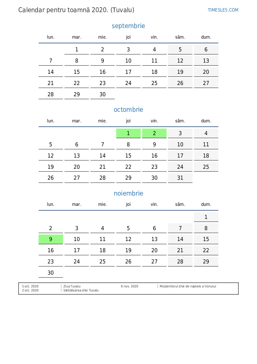 Descărcați și tipăriți calendarul PDF cu sărbătorile și weekendurile pentru toamnă anului 2020 pentru Tuvalu