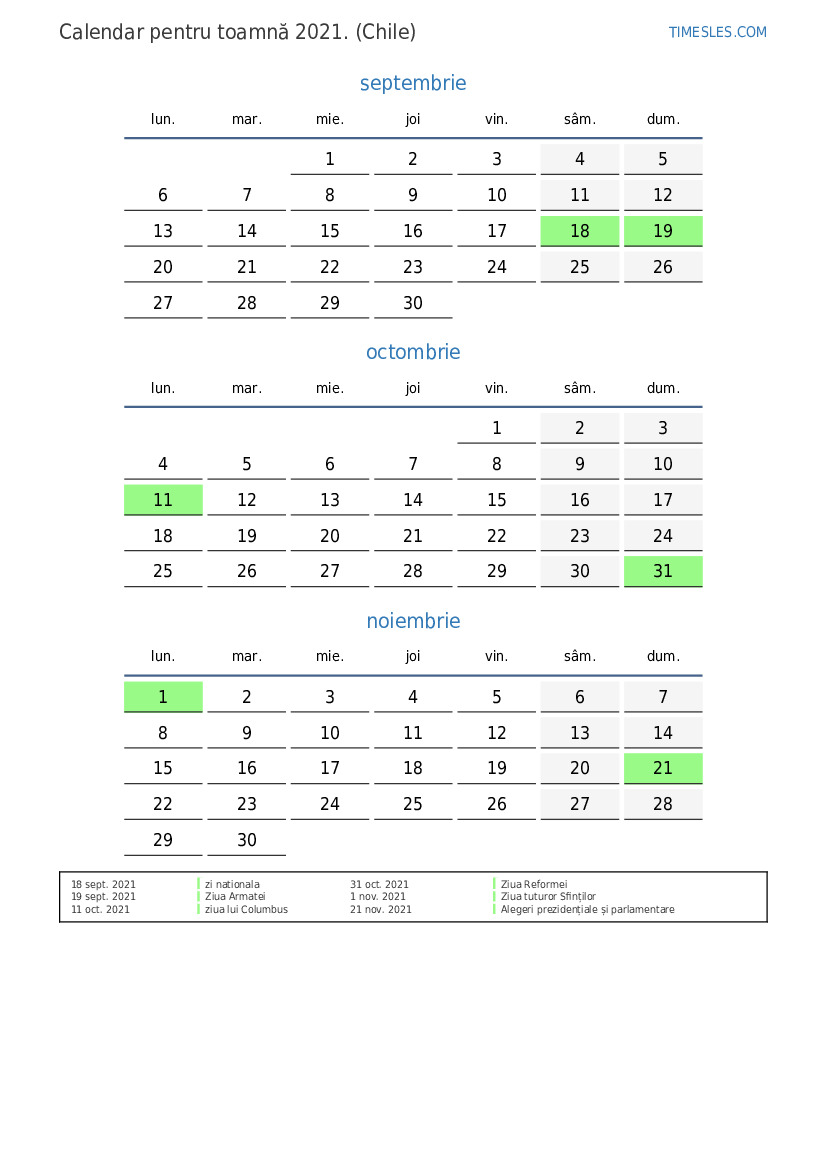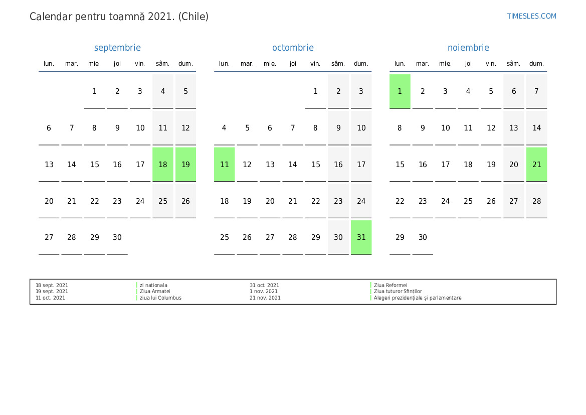 Descărcați și tipăriți calendarul PDF cu sărbătorile și weekendurile pentru toamnă anului 2021 pentru Chile