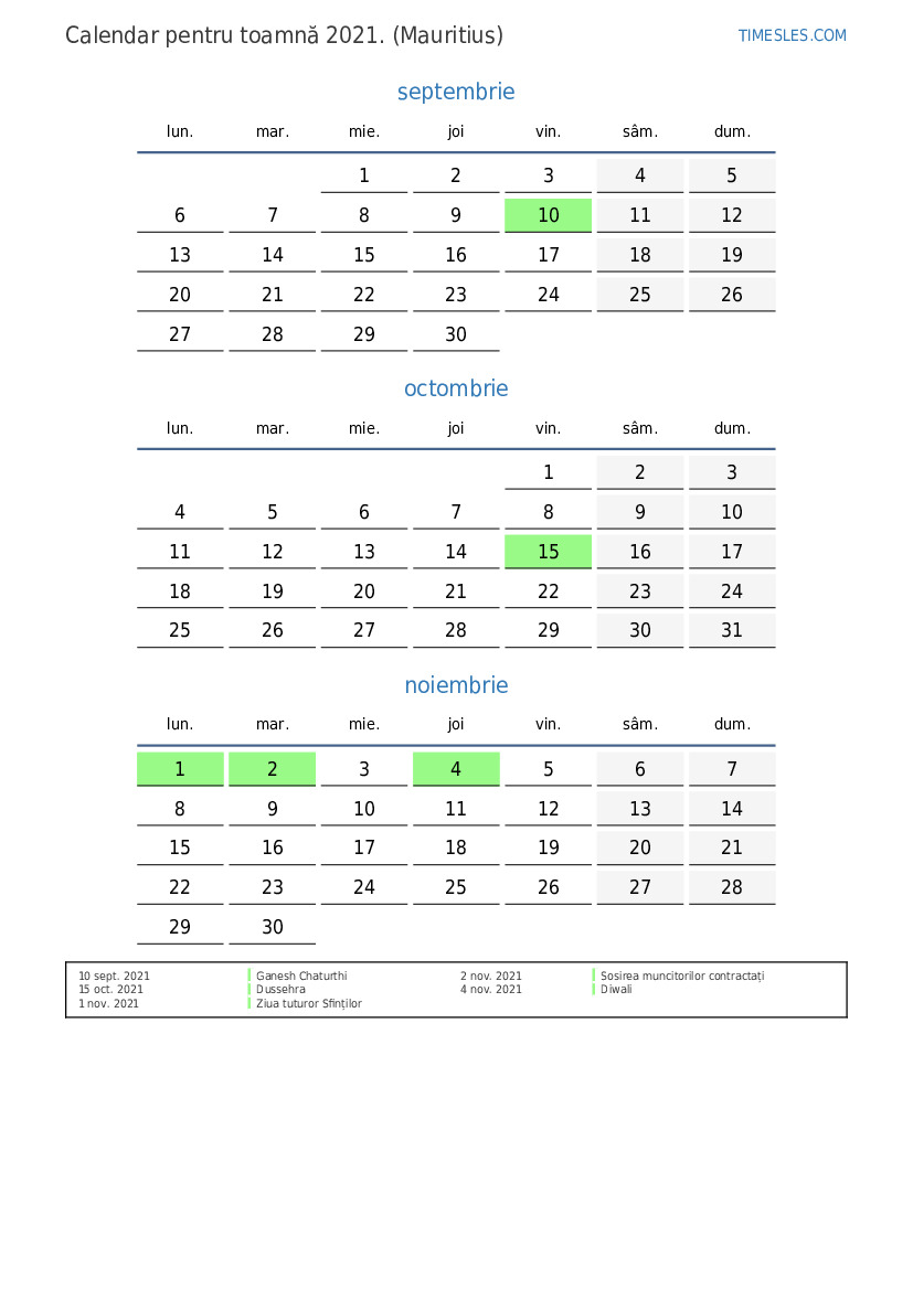 Descărcați și tipăriți calendarul PDF cu sărbătorile și weekendurile pentru toamnă anului 2021 pentru Mauritius