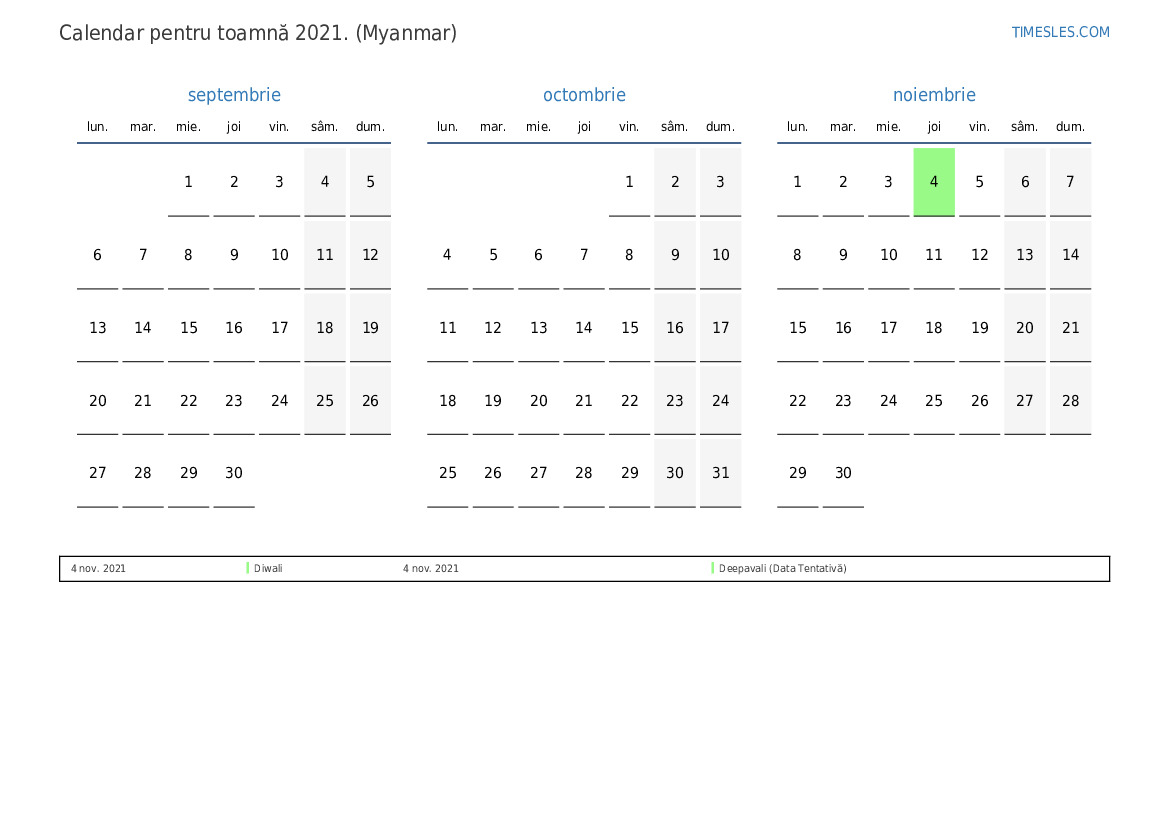 Calendar pentru toamnă 2021 pentru Myanmar