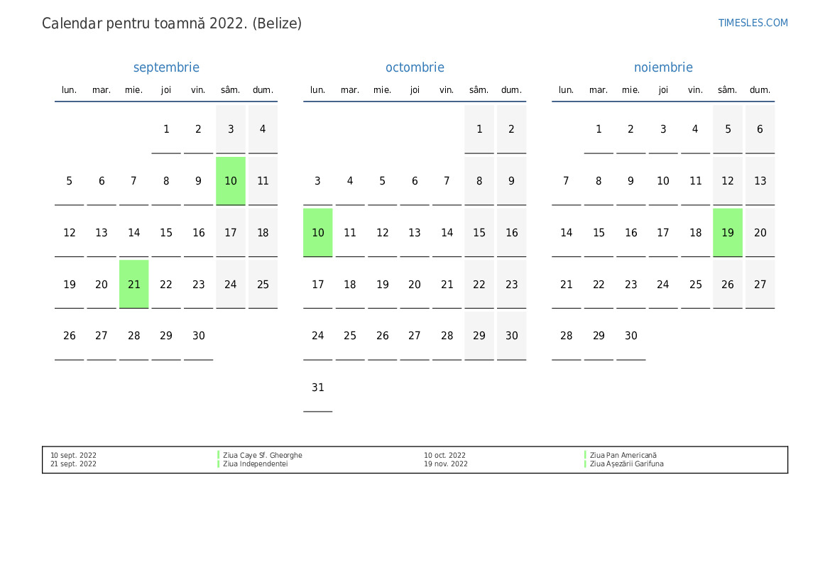 Descărcați și tipăriți calendarul PDF cu sărbătorile și weekendurile pentru toamnă anului 2022 pentru Belize