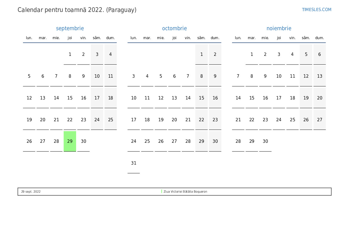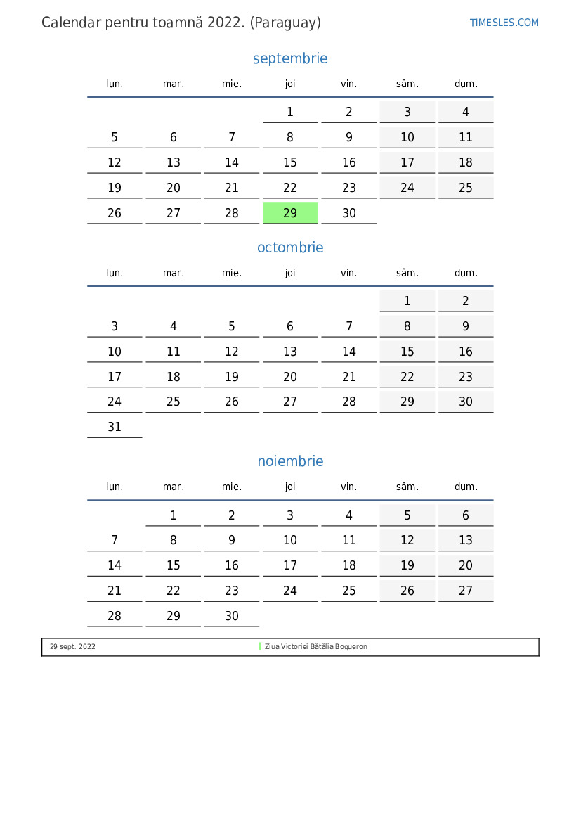 Descărcați și tipăriți calendarul PDF cu sărbătorile și weekendurile pentru toamnă anului 2022 pentru Paraguay
