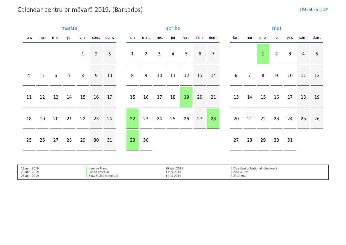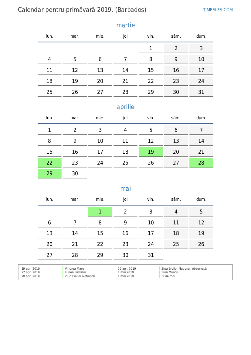 Descărcați și tipăriți calendarul PDF cu sărbătorile și weekendurile pentru primăvară anului 2019 pentru Barbados