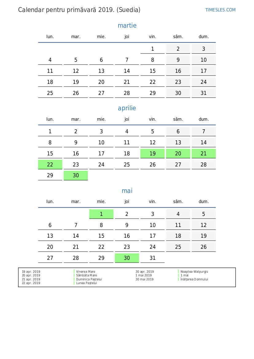 Descărcați și tipăriți calendarul PDF cu sărbătorile și weekendurile pentru primăvară anului 2019 pentru Suedia