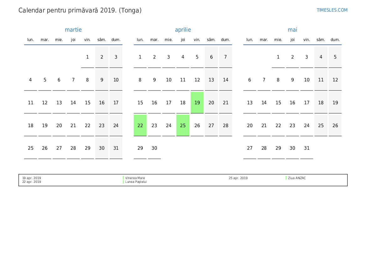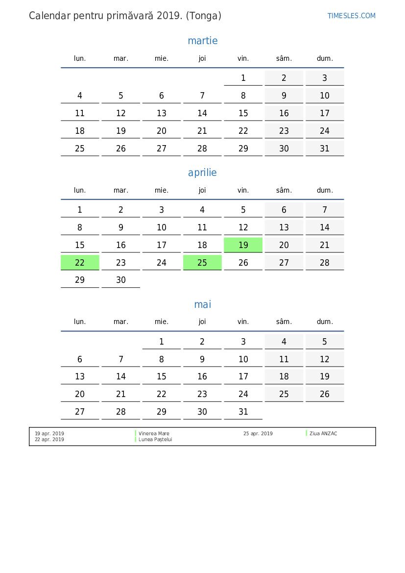 Descărcați și tipăriți calendarul PDF cu sărbătorile și weekendurile pentru primăvară anului 2019 pentru Tonga