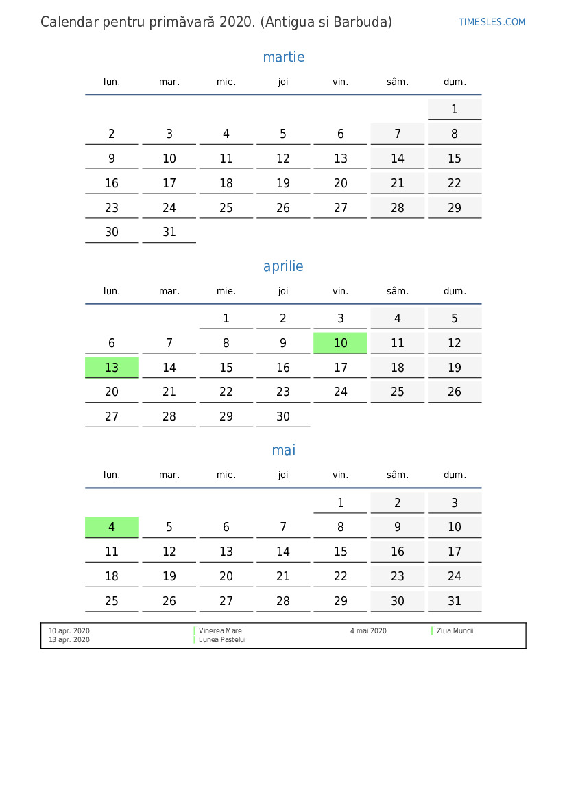 Descărcați și tipăriți calendarul PDF cu sărbătorile și weekendurile pentru primăvară anului 2020 pentru Antigua și Barbuda
