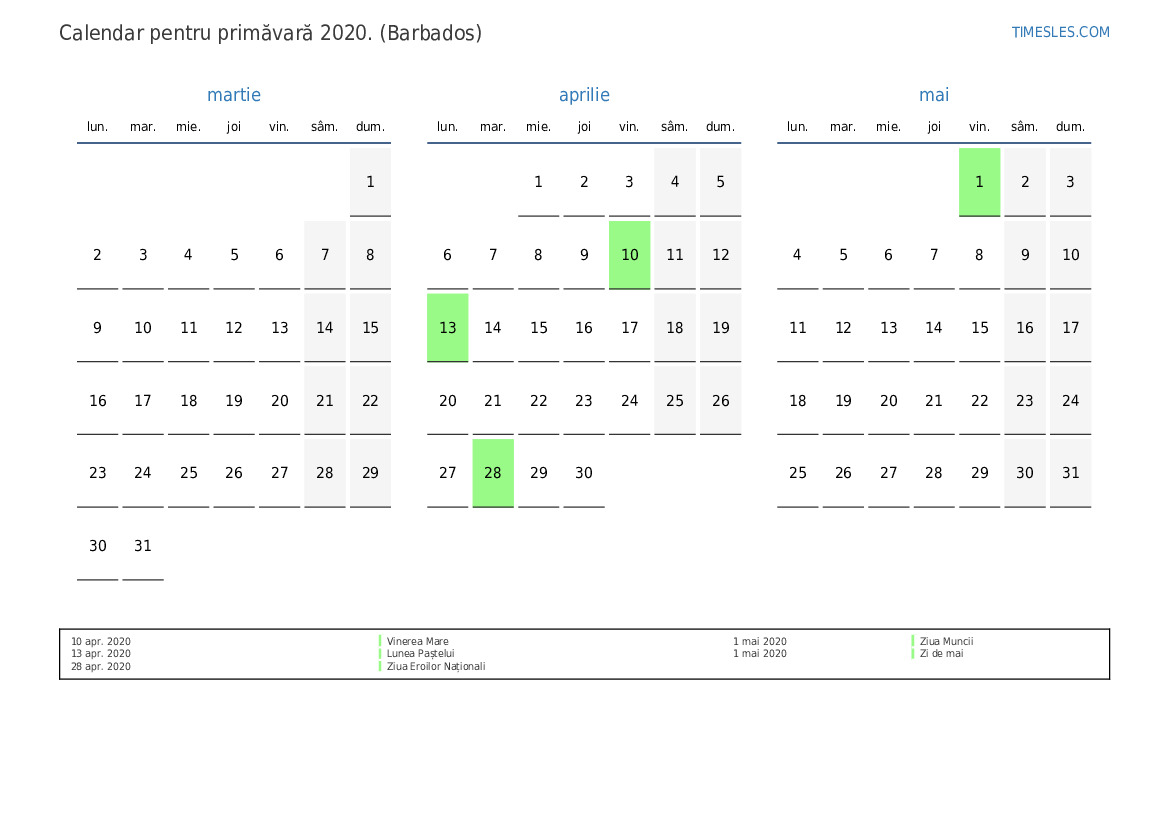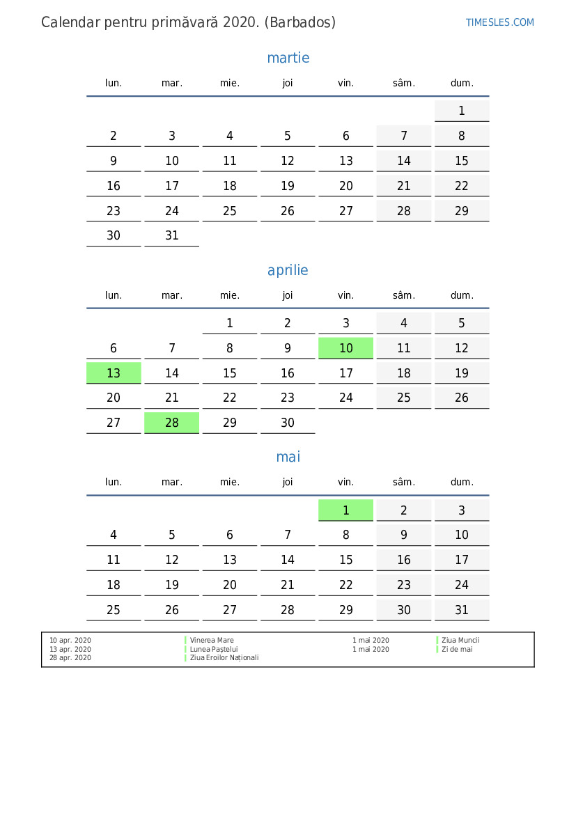 Descărcați și tipăriți calendarul PDF cu sărbătorile și weekendurile pentru primăvară anului 2020 pentru Barbados