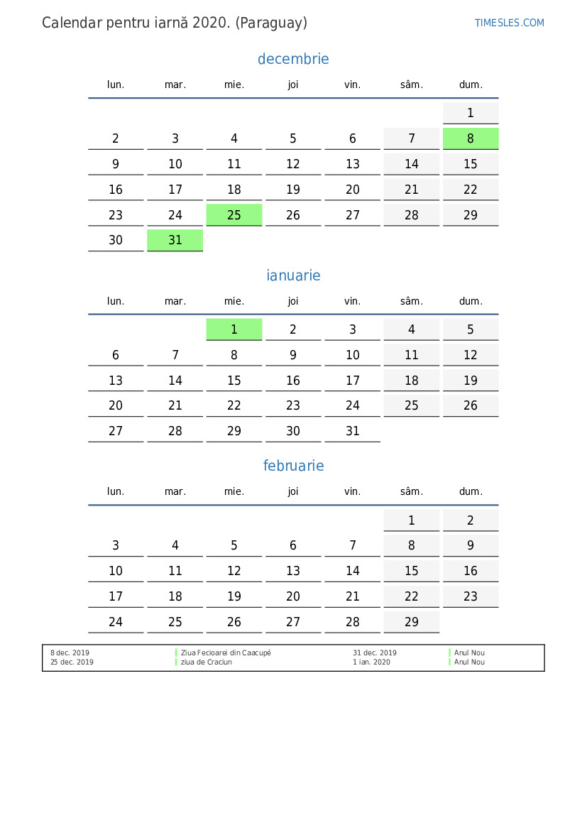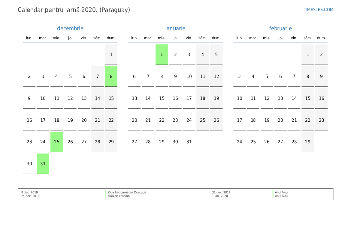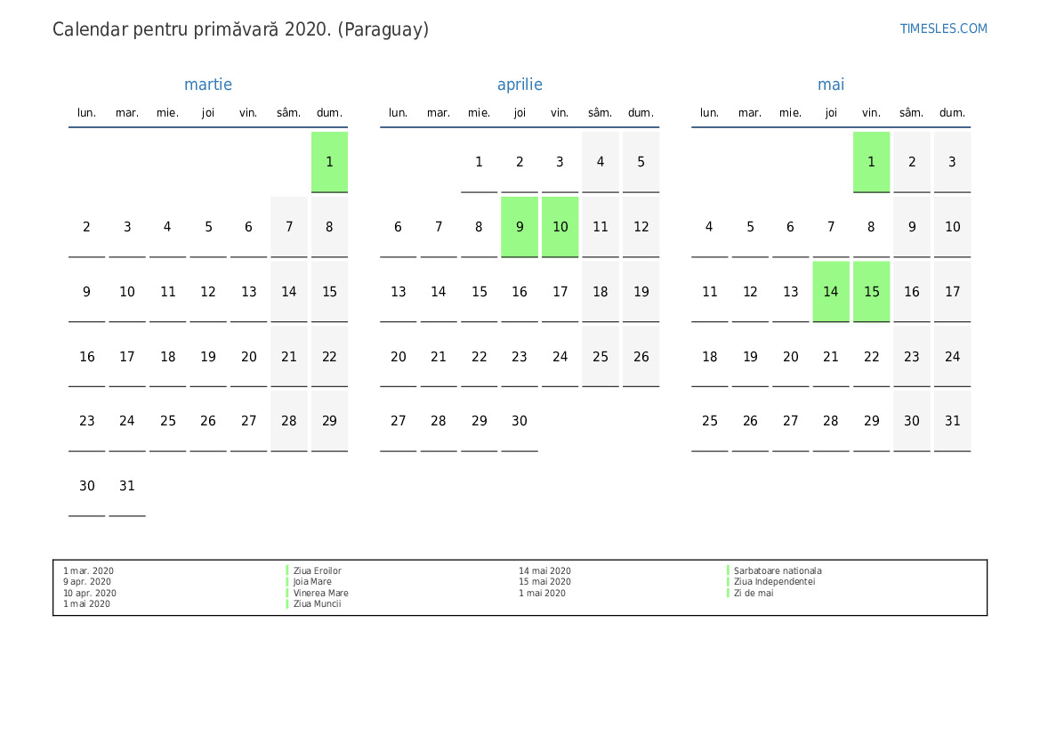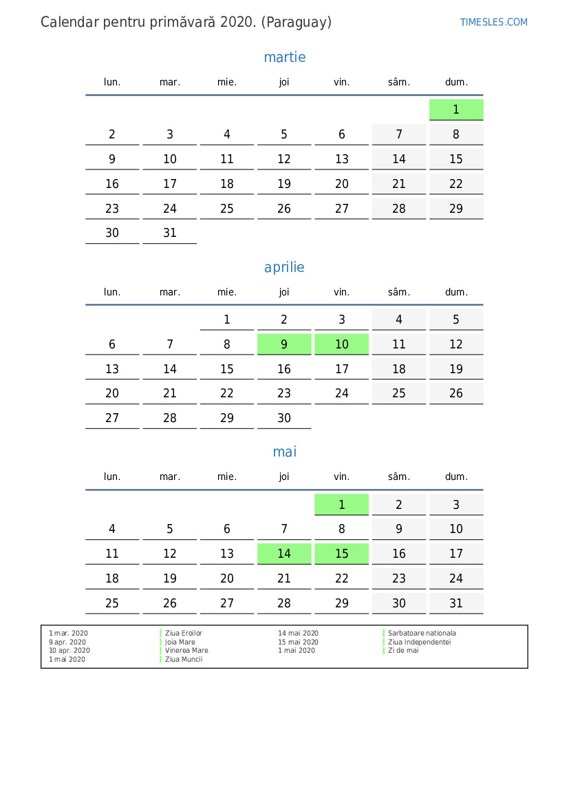 Descărcați și tipăriți calendarul PDF cu sărbătorile și weekendurile pentru primăvară anului 2020 pentru Paraguay