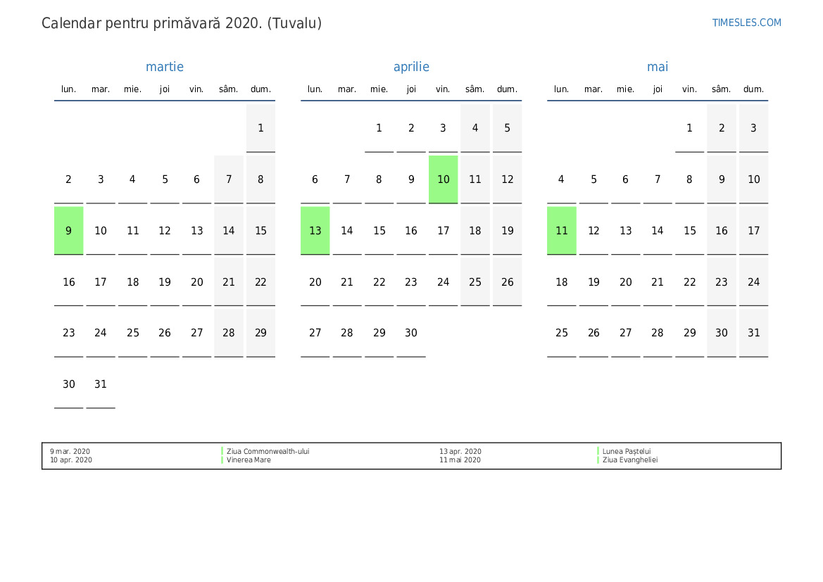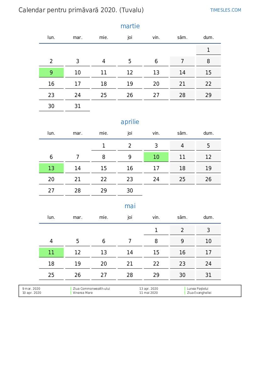 Descărcați și tipăriți calendarul PDF cu sărbătorile și weekendurile pentru primăvară anului 2020 pentru Tuvalu