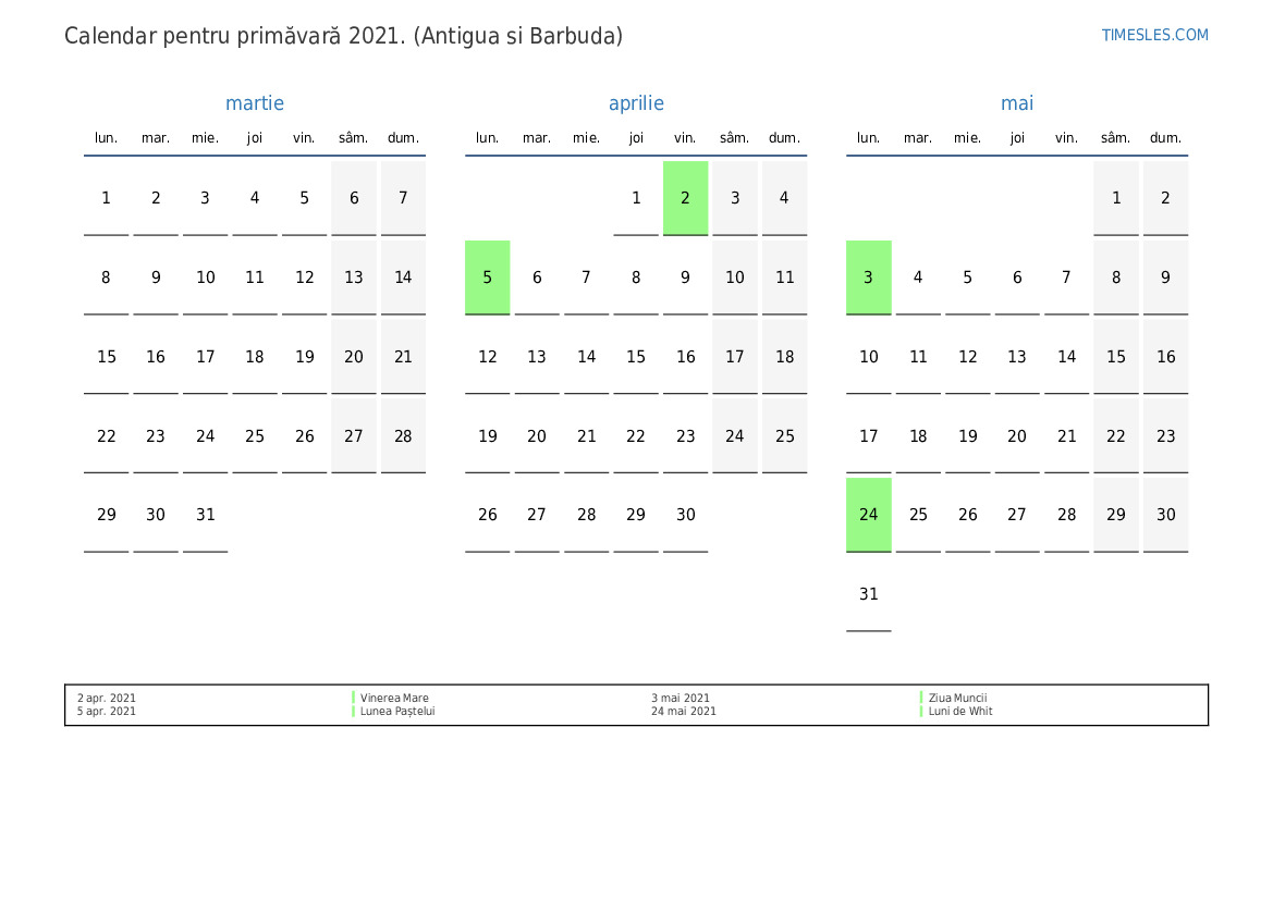 Descărcați și tipăriți calendarul PDF cu sărbătorile și weekendurile pentru primăvară anului 2021 pentru Antigua și Barbuda