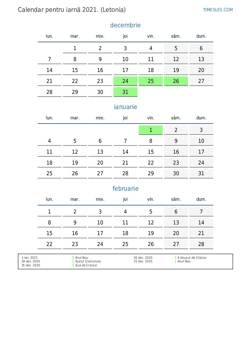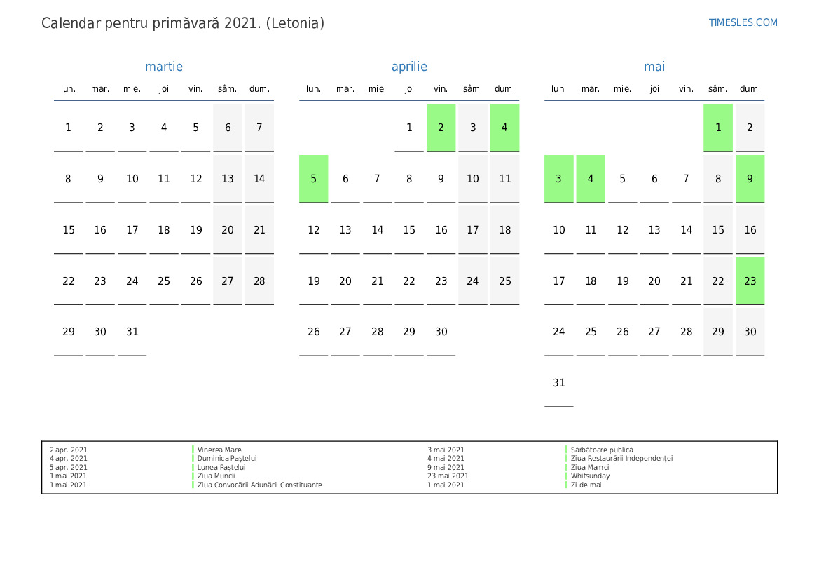 Descărcați și tipăriți calendarul PDF cu sărbătorile și weekendurile pentru primăvară anului 2021 pentru Letonia