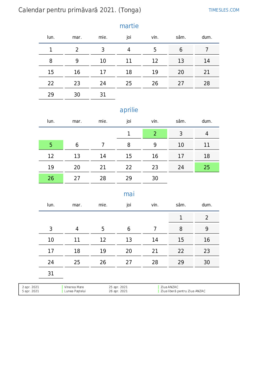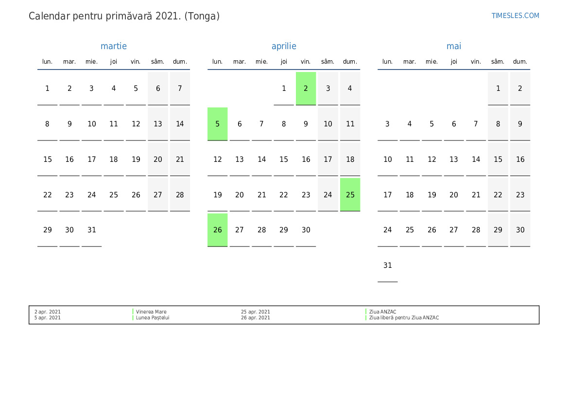 Descărcați și tipăriți calendarul PDF cu sărbătorile și weekendurile pentru primăvară anului 2021 pentru Tonga