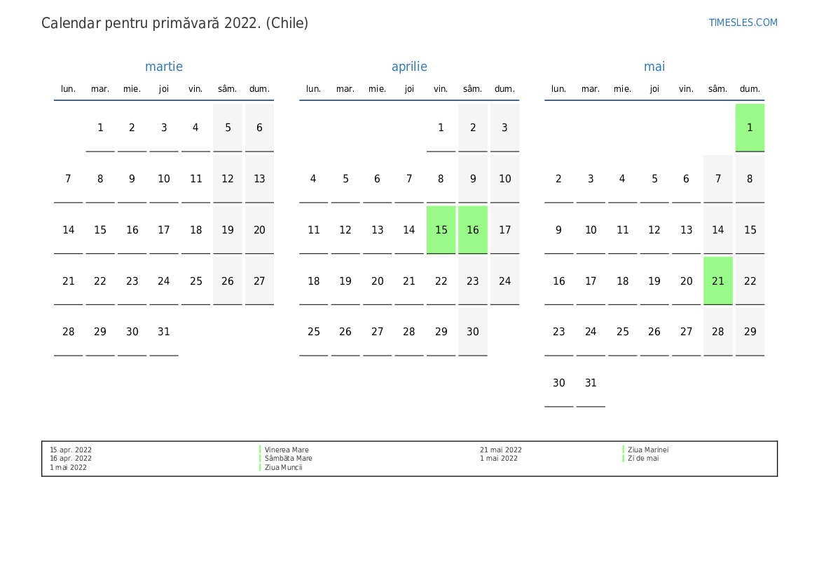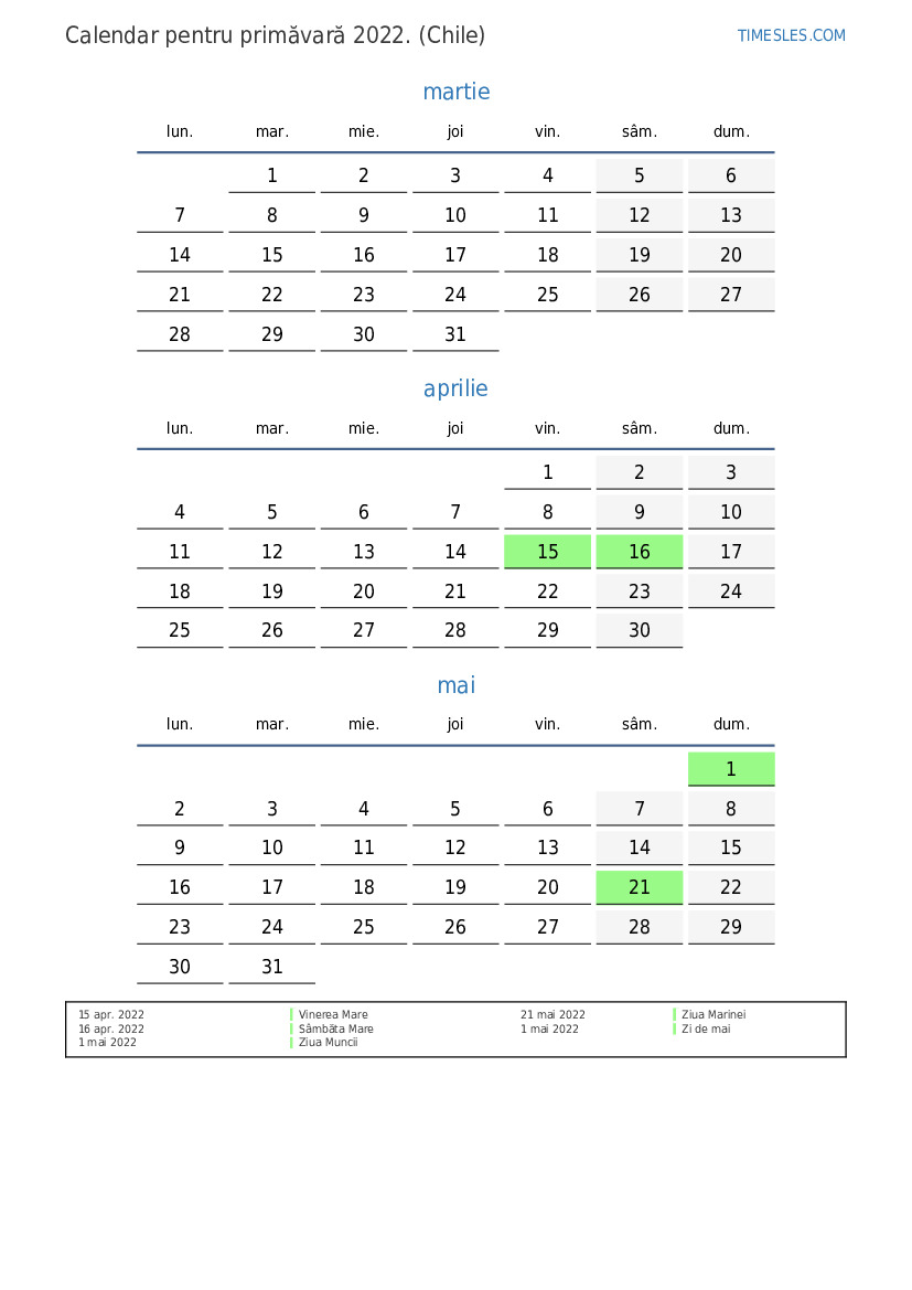 Descărcați și tipăriți calendarul PDF cu sărbătorile și weekendurile pentru primăvară anului 2022 pentru Chile