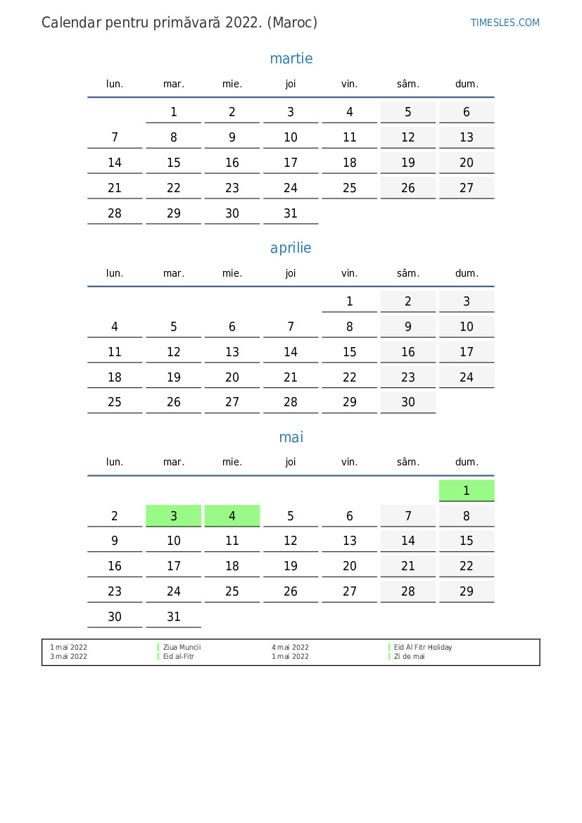 Descărcați și tipăriți calendarul PDF cu sărbătorile și weekendurile pentru primăvară anului 2022 pentru Maroc