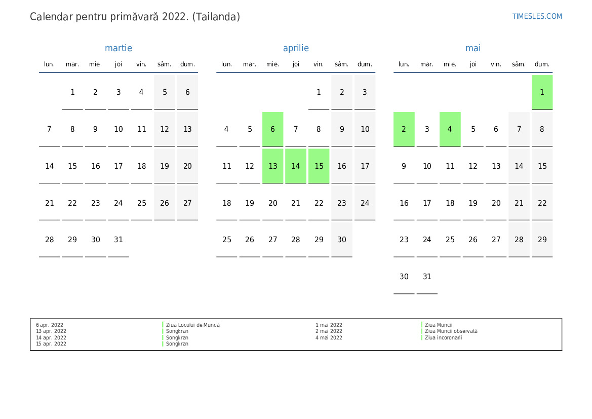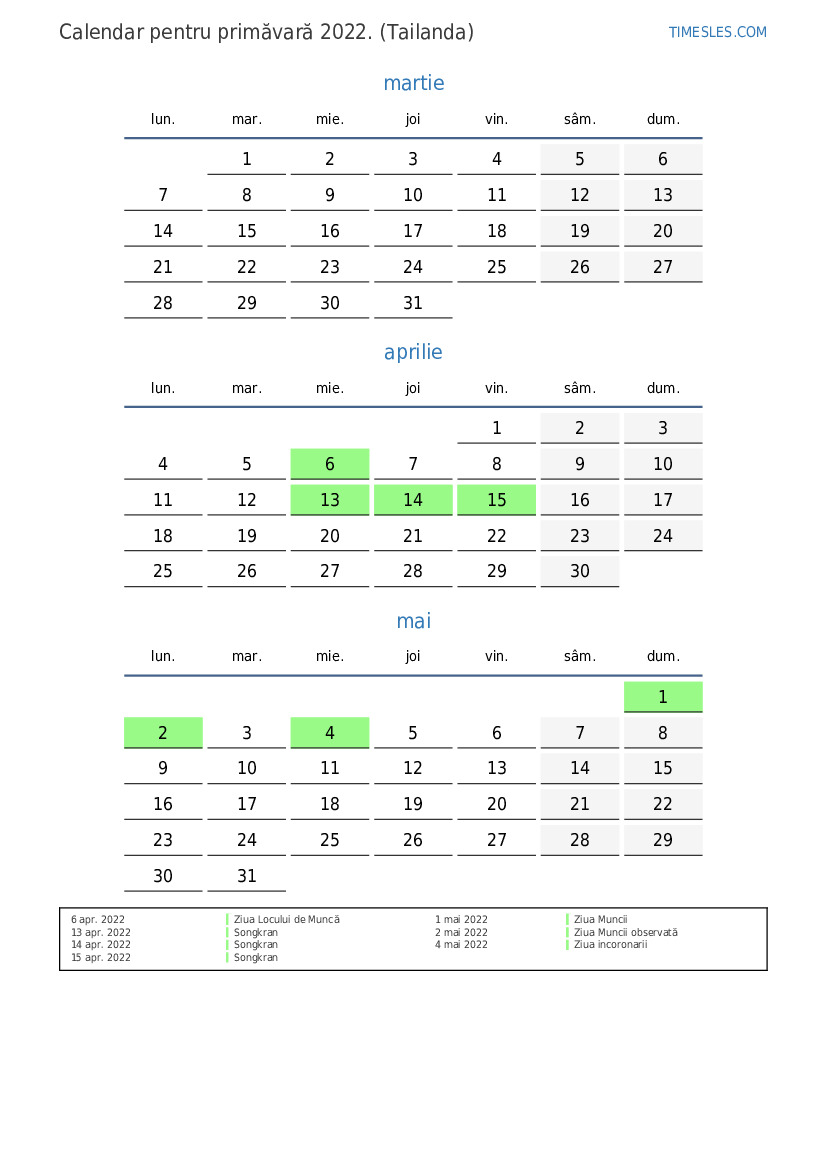 Descărcați și tipăriți calendarul PDF cu sărbătorile și weekendurile pentru primăvară anului 2022 pentru Thailanda