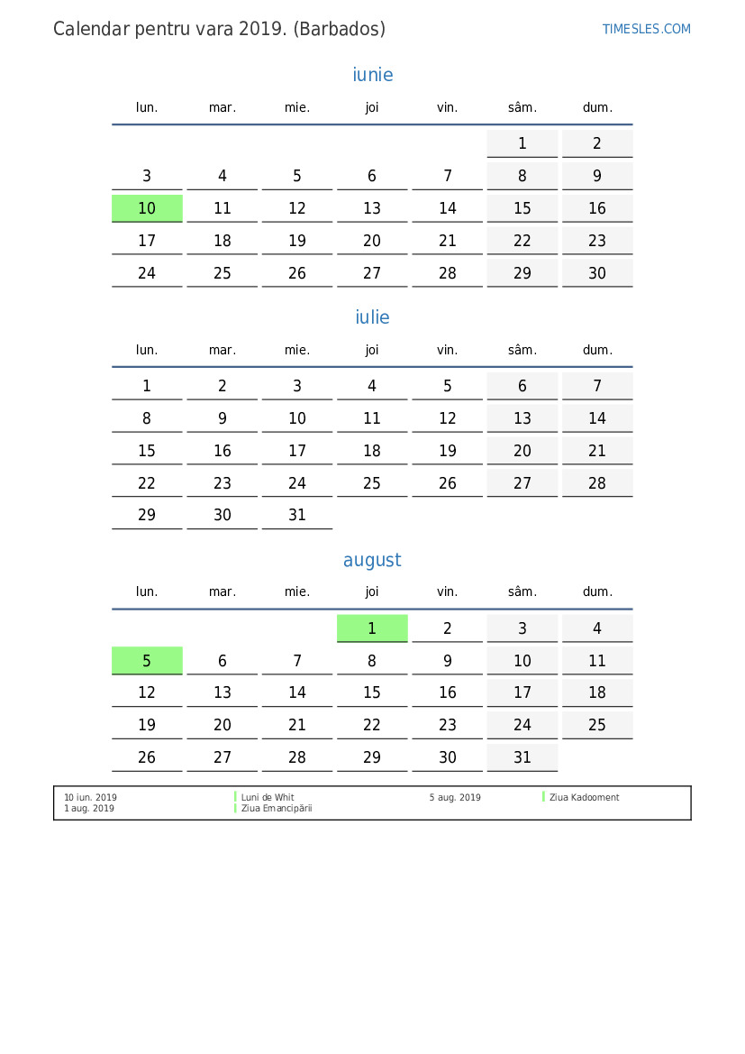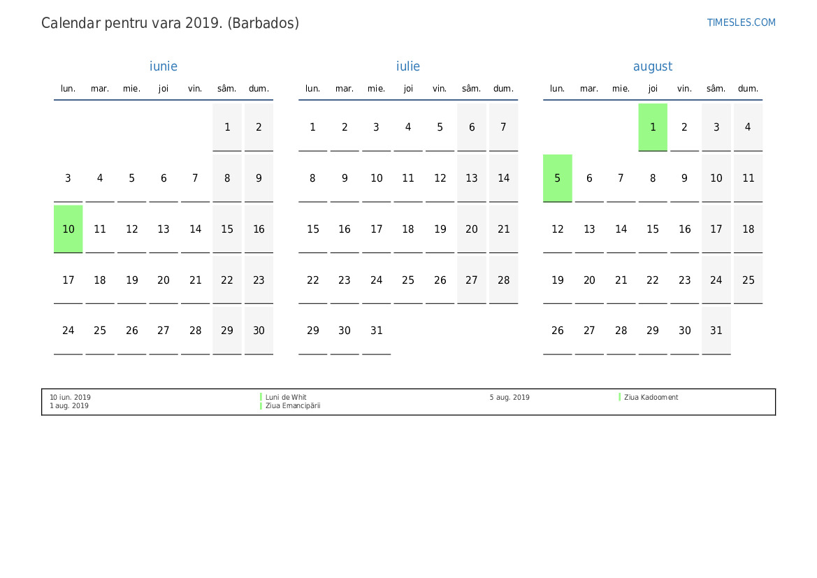 Descărcați și tipăriți calendarul PDF cu sărbătorile și weekendurile pentru vara anului 2019 pentru Barbados