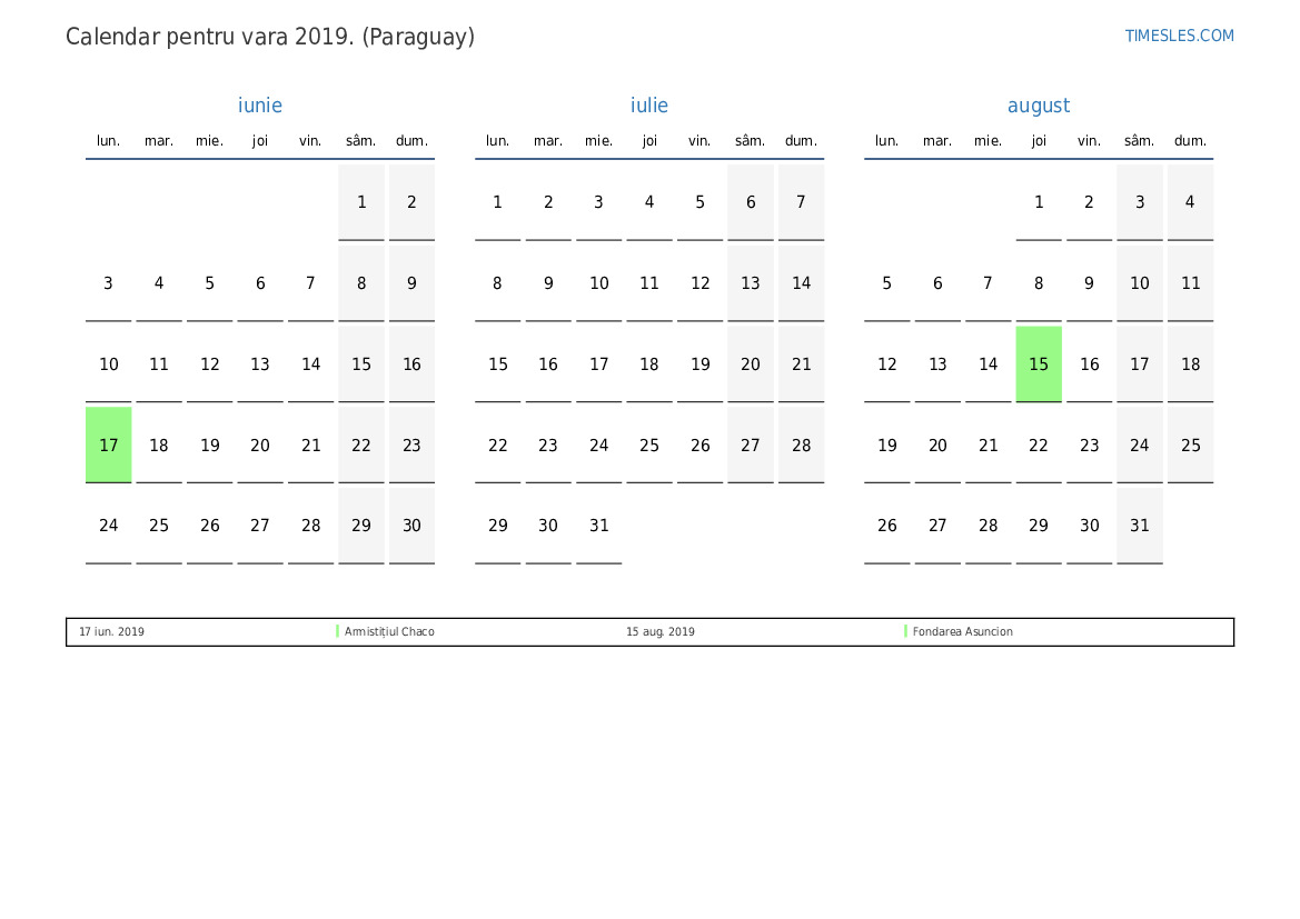 Calendarul sărbătorilor și weekendurilor pentru vara anului 2019 pentru Paraguay