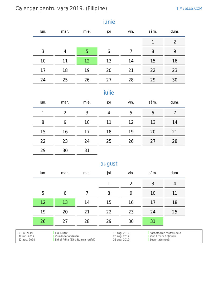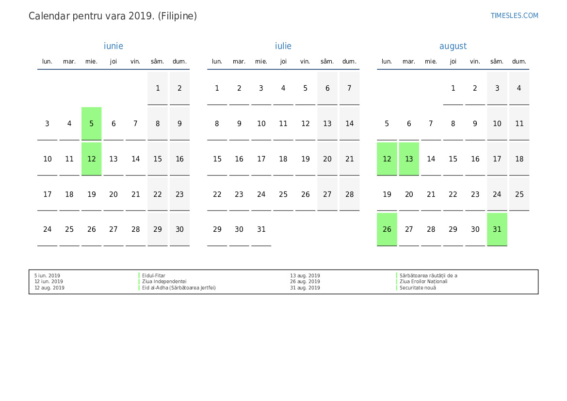 Descărcați și tipăriți calendarul PDF cu sărbătorile și weekendurile pentru vara anului 2019 pentru Filipine