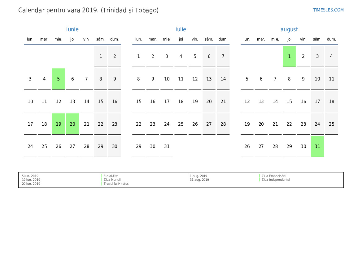 Descărcați și tipăriți calendarul PDF cu sărbătorile și weekendurile pentru vara anului 2019 pentru Trinidad și Tobago