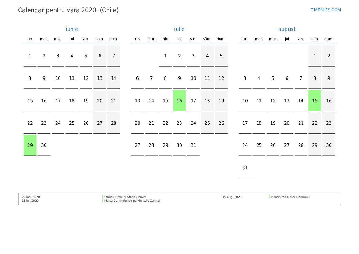 Descărcați și tipăriți calendarul PDF cu sărbătorile și weekendurile pentru vara anului 2020 pentru Chile