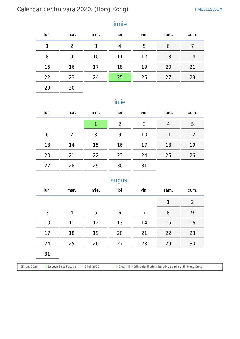 Descărcați și tipăriți calendarul PDF cu sărbătorile și weekendurile pentru vara anului 2020 pentru Hong Kong