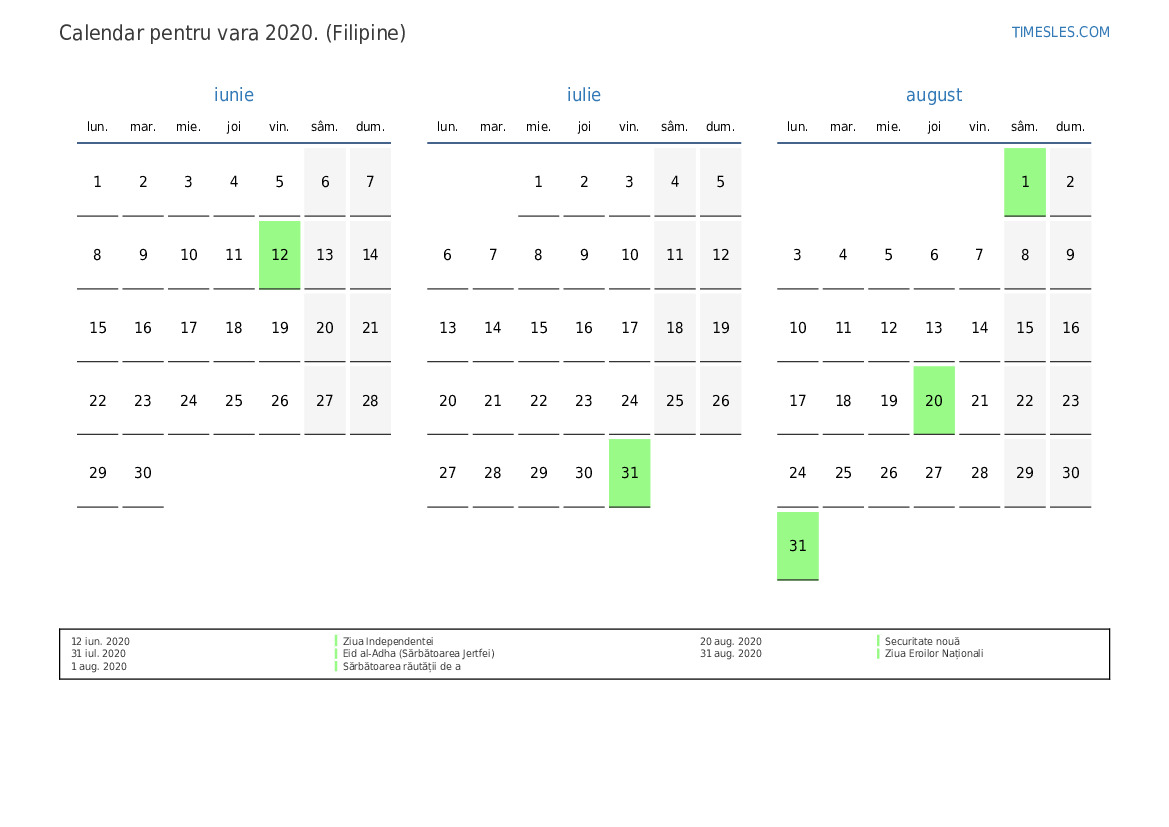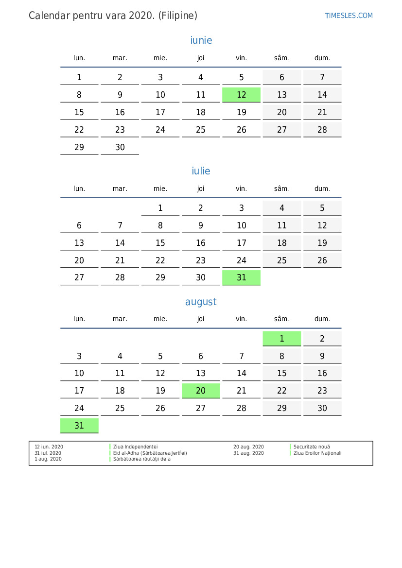 Descărcați și tipăriți calendarul PDF cu sărbătorile și weekendurile pentru vara anului 2020 pentru Filipine