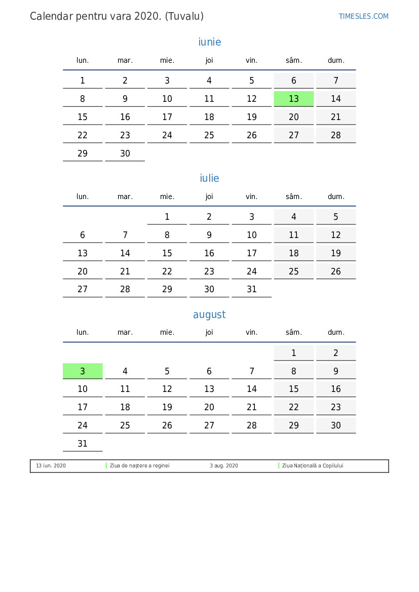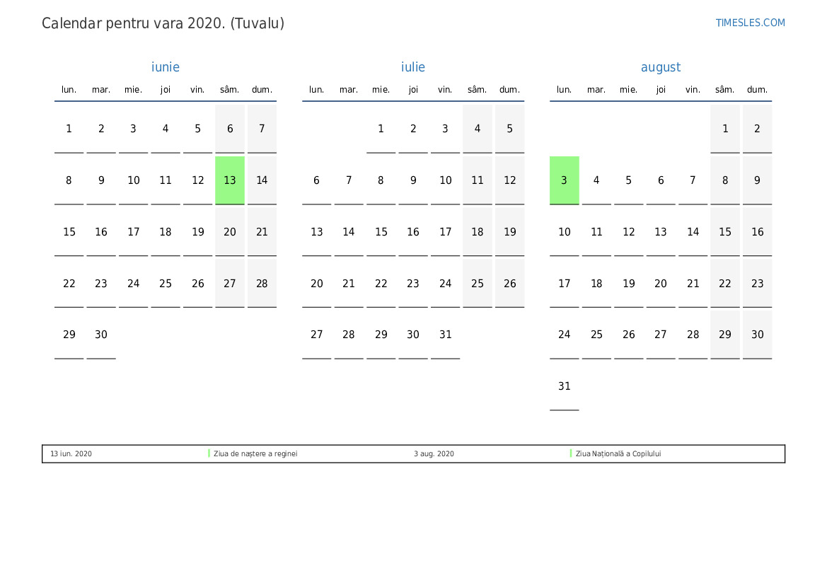 Descărcați și tipăriți calendarul PDF cu sărbătorile și weekendurile pentru vara anului 2020 pentru Tuvalu