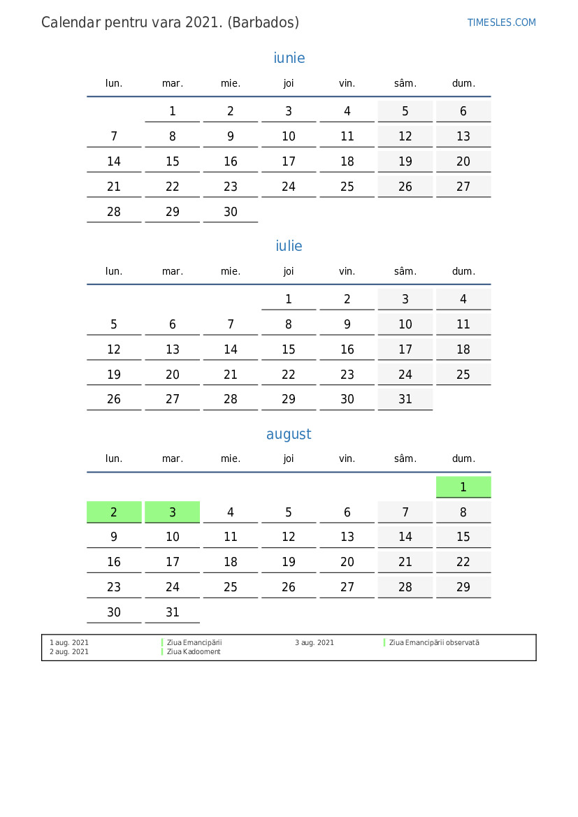 Descărcați și tipăriți calendarul PDF cu sărbătorile și weekendurile pentru vara anului 2021 pentru Barbados
