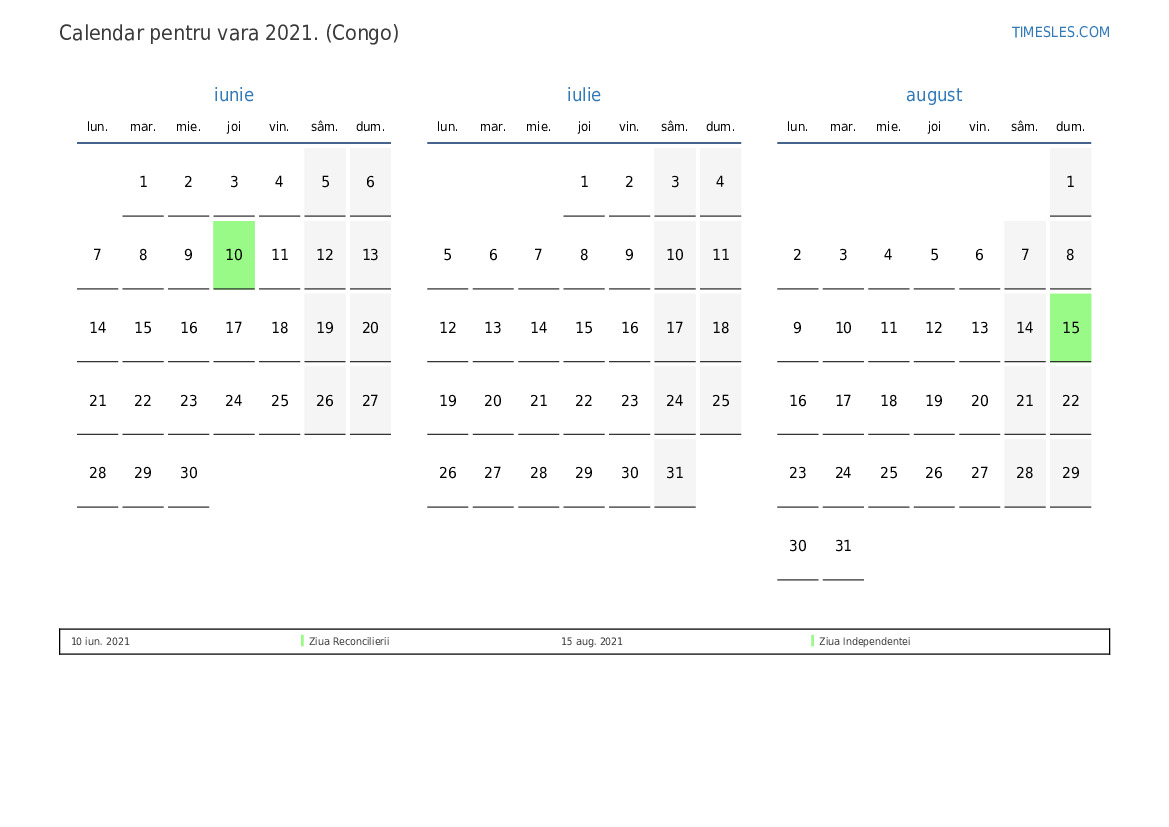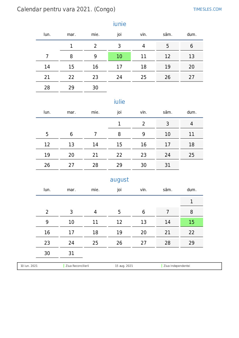 Descărcați și tipăriți calendarul PDF cu sărbătorile și weekendurile pentru vara anului 2021 pentru Congo