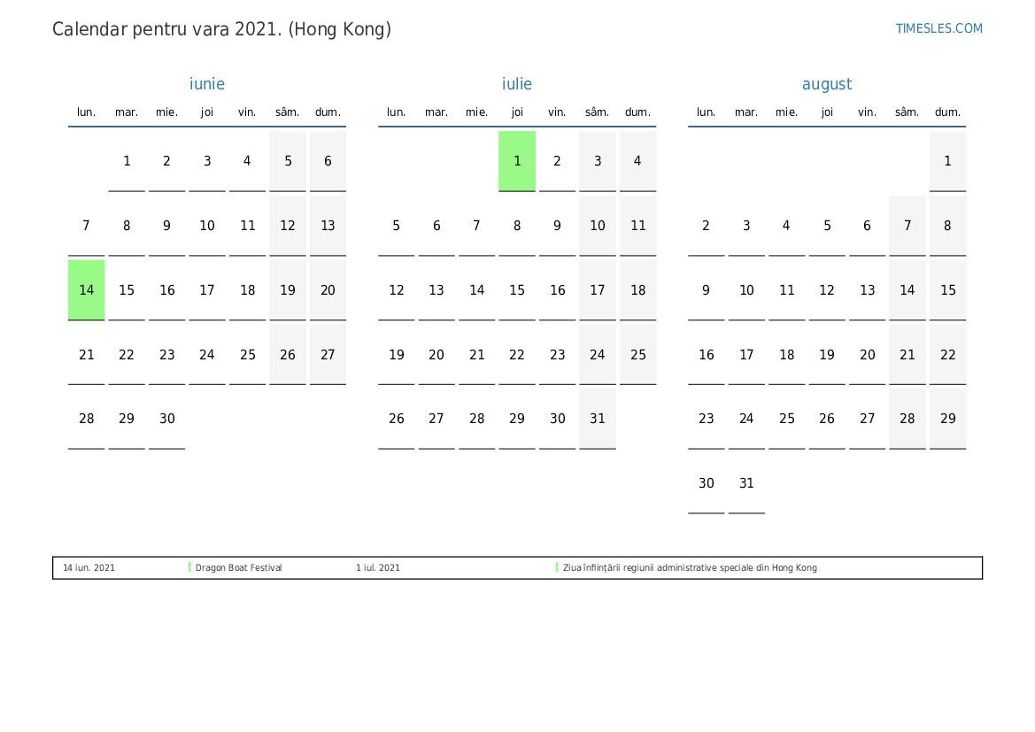 Descărcați și tipăriți calendarul PDF cu sărbătorile și weekendurile pentru vara anului 2021 pentru Hong Kong