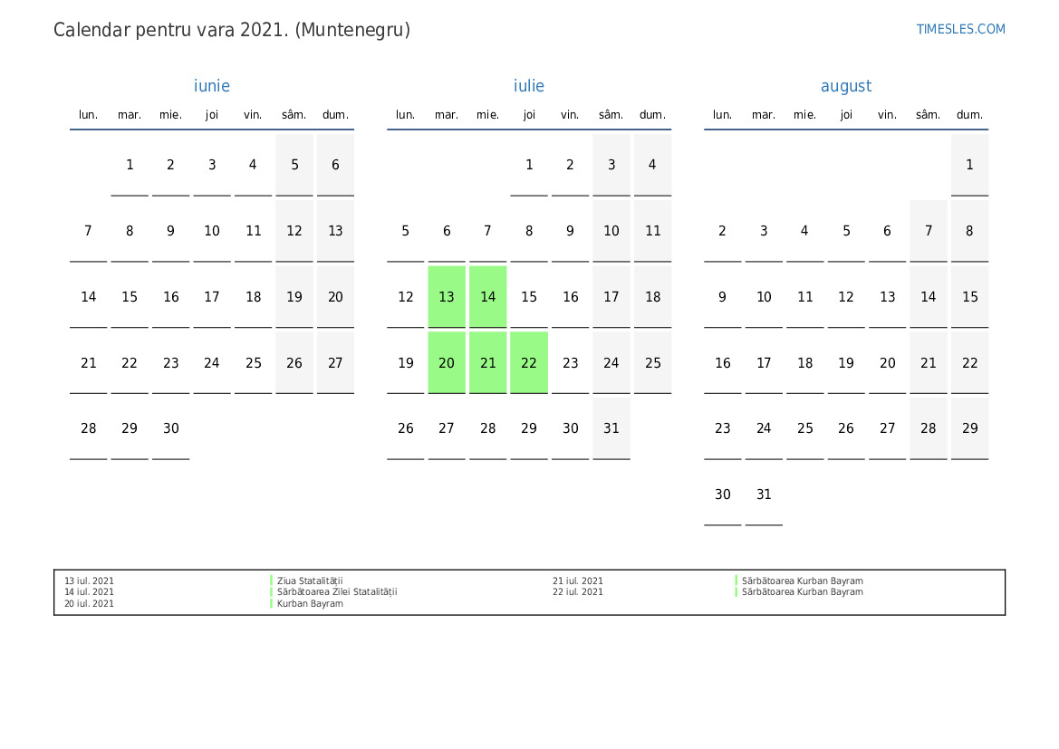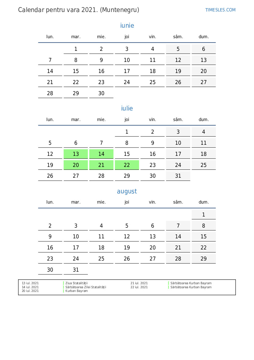 Descărcați și tipăriți calendarul PDF cu sărbătorile și weekendurile pentru vara anului 2021 pentru Muntenegru