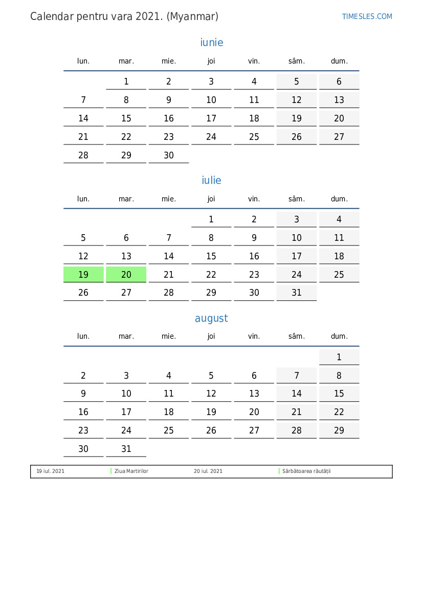 Descărcați și tipăriți calendarul PDF cu sărbătorile și weekendurile pentru vara anului 2021 pentru Myanmar