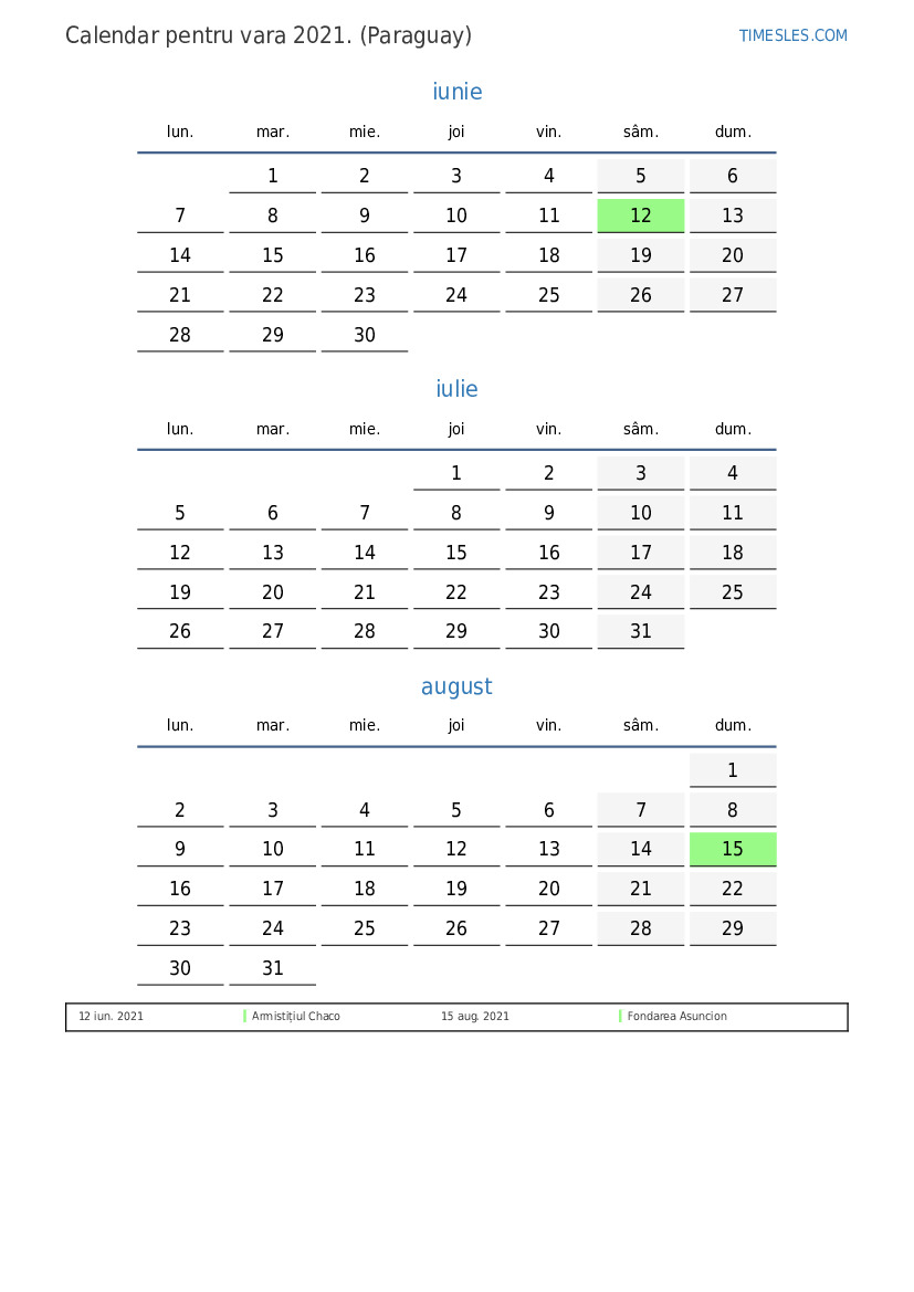 Calendarul sărbătorilor și weekendurilor pentru vara anului 2021 pentru Paraguay