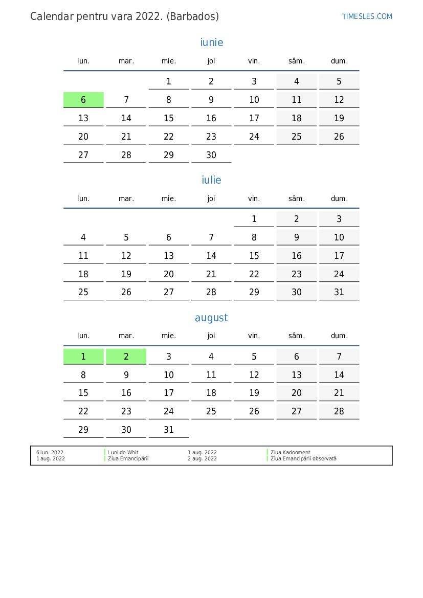 Descărcați și tipăriți calendarul PDF cu sărbătorile și weekendurile pentru vara anului 2022 pentru Barbados
