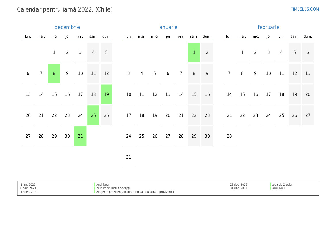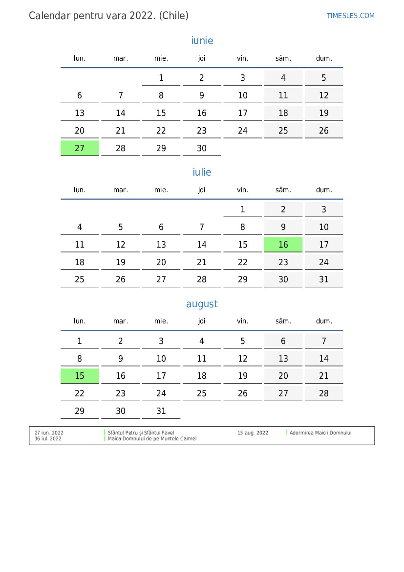 Descărcați și tipăriți calendarul PDF cu sărbătorile și weekendurile pentru vara anului 2022 pentru Chile